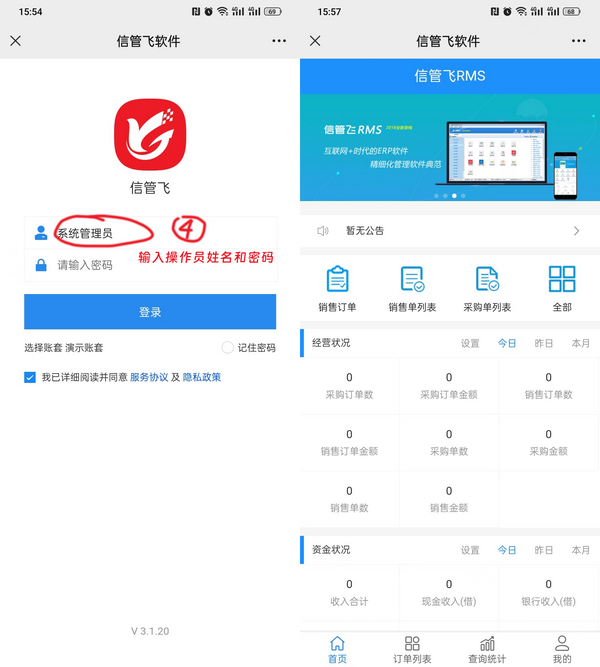 選擇完賬套后,輸入操作員姓名或編碼、密碼,然后點“登錄”按鈕登錄信管飛微信端。
