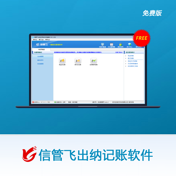 信管飛出納記賬軟件免費版(出納軟件免費版),適合小企業(yè)、店鋪、家庭、個人記賬,操作簡便方便,可拷貝到U盤運行。系統(tǒng)可以有效的規(guī)范記帳業(yè)務,使您能省時省力,準確無誤的管理好公司財務狀況。支持仿真帳簿,可以批量輸出打印帳頁。系統(tǒng)提供了帳簿報表的各種模板,省去了手工操作的種種麻煩。 與信管飛財務出納記賬軟件收費版相比沒有應收應付款管理、票據(jù)管理等功能。