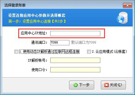 在客戶端程序登錄窗口點擊“選擇賬套”,輸入自購的云主機IP地址,點擊“下一步”后進入選擇賬套界面,選擇需要登錄的帳套即可,如下圖所示: