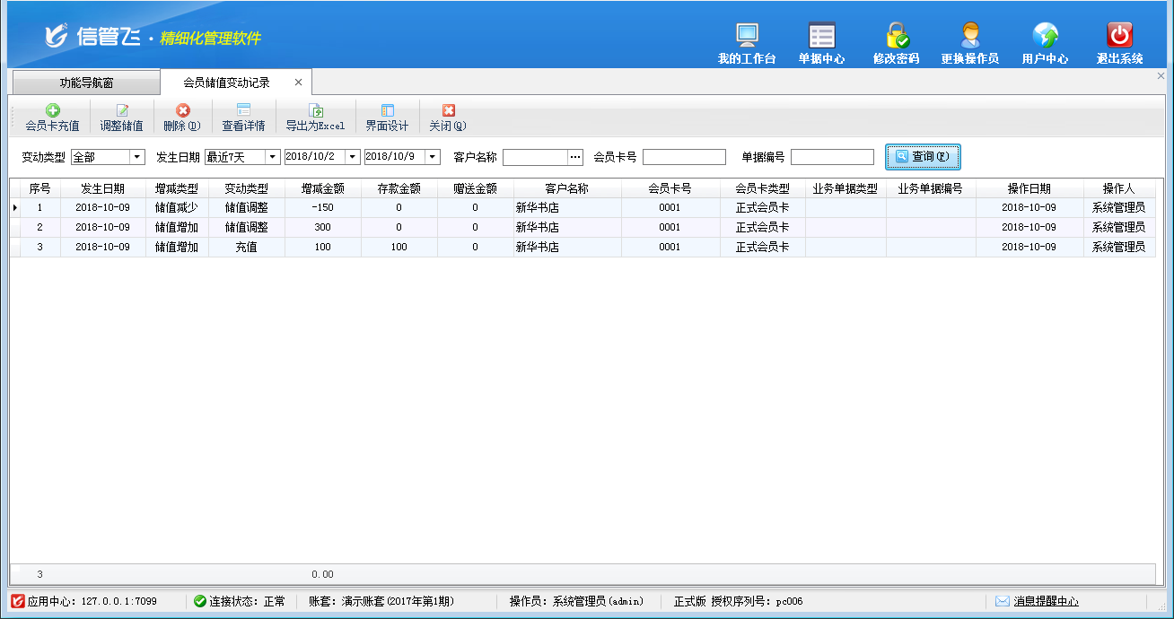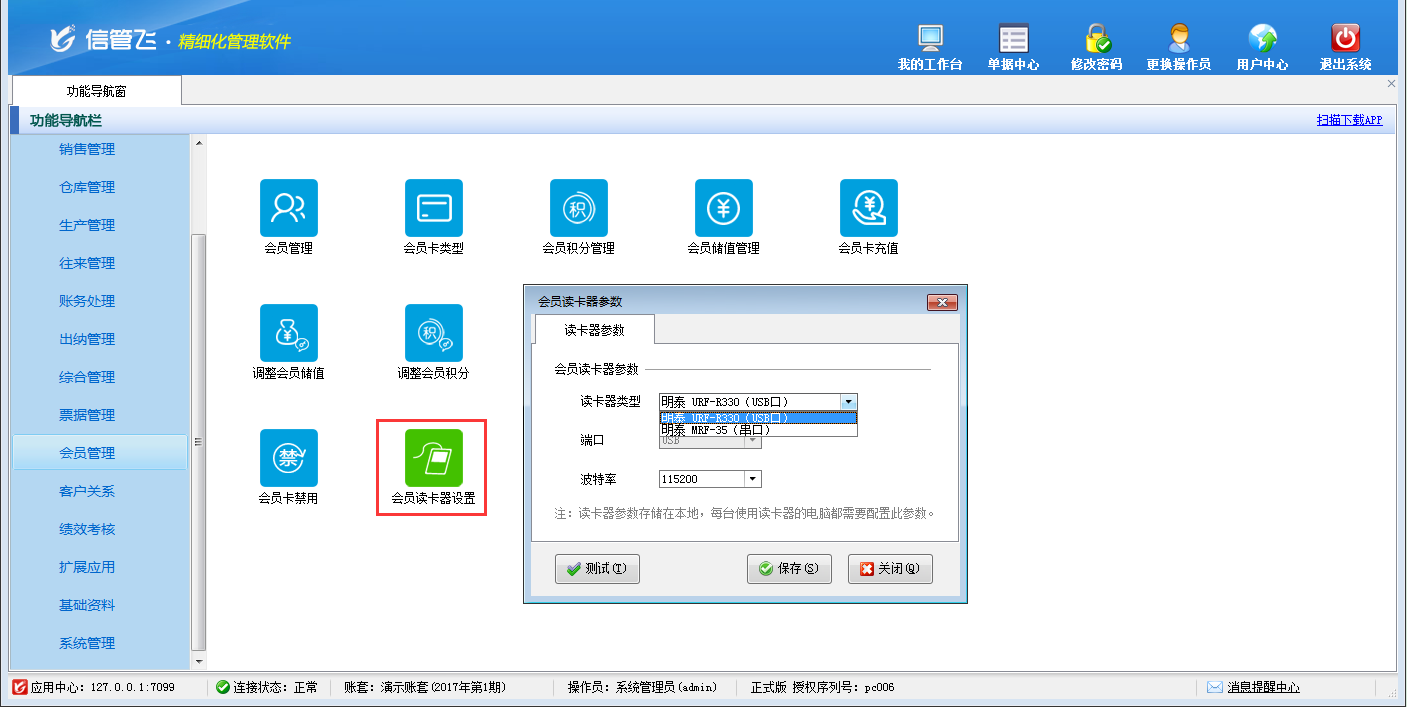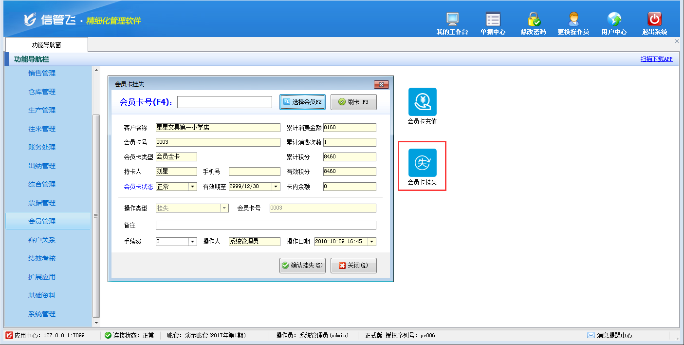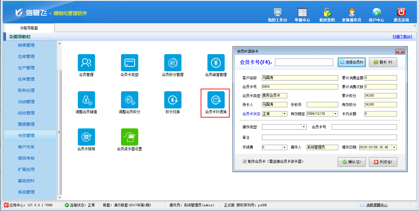 包括功能:會員卡類型維護、會員積分管理、會員儲值管理、調整會員儲值、調整會員積分、會員卡充值、積分兌換、會員卡補退換、會員卡掛失、會員卡禁用、會員讀卡器配置等。