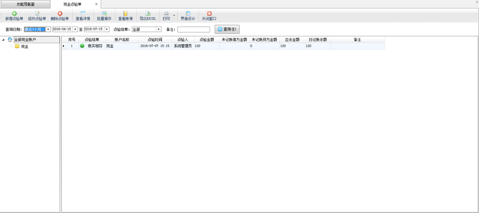 ????在功能導航窗,點擊“出納管理”—》“現金點驗單”,即可進入“現金點驗單”界面,如下圖所示: