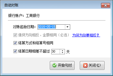 ????在工具欄中點擊“自動對賬”按鈕,系統彈出“自動對賬”窗口,選擇對賬起始日期及相關選項后,點擊“開始勾對”按鈕即可,如下圖所示:
