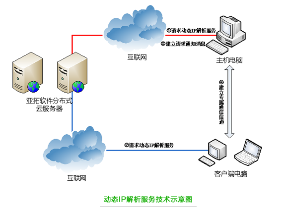 ????動(dòng)態(tài)IP解析服務(wù)是亞拓軟件開發(fā)的基于互聯(lián)網(wǎng)的遠(yuǎn)程連接解決方案,采用專屬安全技術(shù)。啟用動(dòng)態(tài)IP解析服務(wù)后,客戶端電腦只要能夠連接互聯(lián)網(wǎng),就可以通過解析賬戶名和密碼連接到應(yīng)用中心使用軟件。動(dòng)態(tài)IP解析服務(wù)的簡單原理如下圖所示: