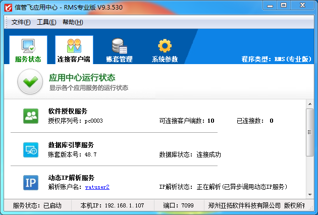 ????應(yīng)用中心可以全面掌控軟件的運(yùn)行情況,可以隨時(shí)查看各類服務(wù)的運(yùn)行狀態(tài),主要包括軟件授權(quán)服務(wù)情況、數(shù)據(jù)庫引擎服務(wù)情況、動(dòng)態(tài)IP解析服務(wù)情況、手機(jī)短信服務(wù)情況等。
