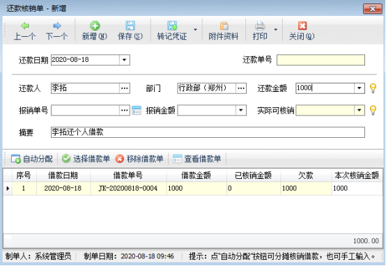 ????還款核銷:在借款單列表中,選擇一個借款單,點擊工具欄中的“還款核銷”按鈕,系統彈出“還款核銷單”窗口,在窗口中錄入還款信息后,點擊“保存”即可。如下圖所示: