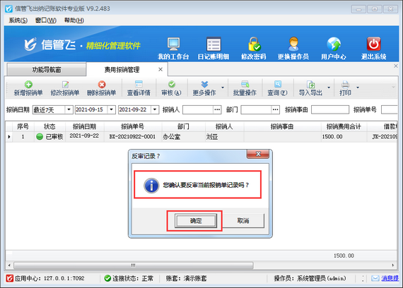 ????在功能導航窗點擊“綜合管理”—》“費用報銷管理”打開費用報銷管理界面,選擇一個已審核的費用報銷單,然后在工具欄點擊“更多操作”—》“反審報銷單”,系統會彈出提示信息“您確認要反審當前報銷單記錄嗎?”,點擊“確定”按鈕即可對已審核的費用報銷單進行反審操作,反審后,費用報銷單狀態變為“待審核”,此時可以對這個待審核的費用報銷單進行修改操作,如下圖所示。