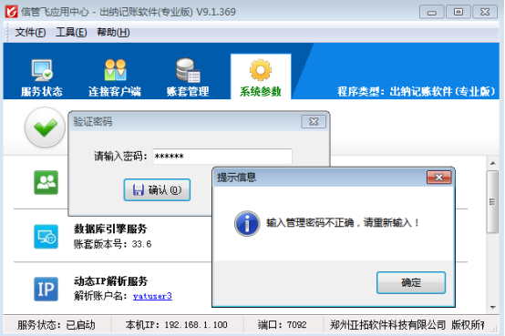 亞拓軟件采用新架構(gòu)技術(shù)開(kāi)發(fā)的信管飛RMS(進(jìn)銷(xiāo)存軟件)、信管飛送貨單軟件、信管飛出納記賬軟件、信管飛倉(cāng)庫(kù)管理軟件等都包括應(yīng)用中心及客戶(hù)端程序,“應(yīng)用中心”是系統(tǒng)的管理控制中心,集中管理連接客戶(hù)端和賬套數(shù)據(jù)庫(kù),從而實(shí)現(xiàn)數(shù)據(jù)的集中存儲(chǔ)和實(shí)時(shí)共享,應(yīng)用中心主要包括運(yùn)行狀態(tài)管理、連接客戶(hù)端管理、賬套管理、系統(tǒng)參數(shù)設(shè)置以及其他管理功能。 應(yīng)用中心的管理和配置會(huì)對(duì)軟件的運(yùn)行產(chǎn)生重大影響,因此軟件提供增強(qiáng)安全驗(yàn)證功能,啟用安全驗(yàn)證后執(zhí)行賬套管理、系統(tǒng)參數(shù)設(shè)置等功能時(shí)會(huì)要求輸入密碼,驗(yàn)證密碼通過(guò)后才可以進(jìn)行相應(yīng)操作。下面我們以信管飛出納