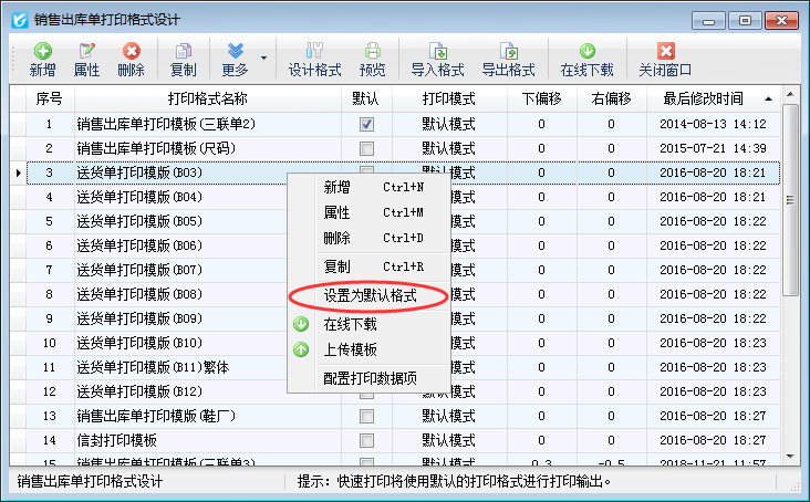信管飛送貨單軟件、信管飛RMS軟件、信管飛倉(cāng)庫(kù)管理軟件等在軟件內(nèi)都內(nèi)置了多種打印格式,除此之外,軟件也支持自定義設(shè)計(jì)打印格式模板,為了開(kāi)單打印單據(jù)方便,軟件可以把常用的模板設(shè)置為默認(rèn)模板,開(kāi)單保存后直接進(jìn)行打印操作。不需要再次選擇模板進(jìn)行打印。 本文以信管飛RMS為例,示范下如何設(shè)置常用的打印模板為默認(rèn)模板。首先打開(kāi)銷(xiāo)售出庫(kù)單打印格式設(shè)計(jì)界面,在單據(jù)界面,點(diǎn)擊工具欄中的“打印”—》“打印格式設(shè)計(jì)”進(jìn)入銷(xiāo)售出庫(kù)單打印格式設(shè)計(jì)界面,在此界面進(jìn)行設(shè)置默認(rèn)打印格式模板操作。有以下三種操作形式: