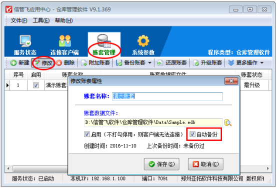 信管飛送貨單軟件、信管飛RMS、信管飛出納記賬軟件、信管飛倉庫管理軟件及信管飛票據軟件都支持設置賬套自動備份,我們強烈建議啟用自動備份功能,以便賬套出現問題的時候從賬套備份文件中恢復數據。下面我們以信管飛倉庫管理軟件為例詳細介紹一下如何啟用賬套自動備份功能? 首先打開軟件應用中心主界面,點擊“系統參數”—》“賬套備份參數”,可以打開賬套備份參數界面,賬套備份參數內可設置是否啟用自動備份、備份時間間隔和備份目錄,如圖1所示。圖1 勾選“啟用賬套自動備份”即可啟用系統賬套自動備份功能,軟件