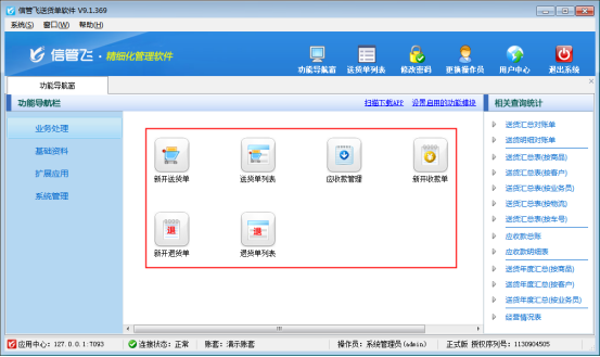 信管飛送貨單軟件是集送貨單、退貨單、訂單、銷售收款等功能為一體的送貨管理及打印軟件。 軟件界面默認顯示所有的功能模塊,主要包括新開送貨單、送貨單列表、應收款管理、新開收款單、收款單列表、新開退貨單、退貨單列表、新開訂單、訂單列表。軟件支持隱藏不需要的功能模塊,下邊我們在信管飛送貨單軟件中示范如何隱藏不需要的功能模塊。 登錄軟件,軟件首界面右側有“設置啟用的功能模塊”按鈕,如圖1所示: 圖1 點