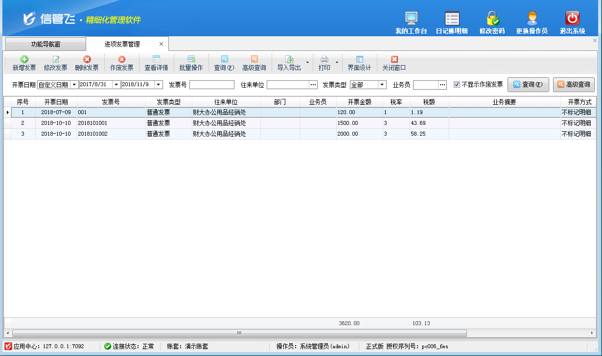 進項發票和銷項發票是對一般納稅人來說的,一般納稅人購進貨物收取的發票稱為進項發票,一般納稅人銷售貨物開出的發票稱為銷項發票。企業在采購和銷售過程中都存在開發票的情況,信管飛出納記賬軟件專業版中發票管理功能可以讓企業高效快速地管理發票信息。下面介紹一下進項發票管理的使用方法。 在功能導航窗中點擊“往來管理”—》“進項發票管理”,即可進入“進項發票管理”界面,其界面如下圖所示。 新增發票:點擊“新增發票”按鈕,進入“進項發票管理”界面,可以直接錄入進項發票信息,支持2種開票方式(按單據及不