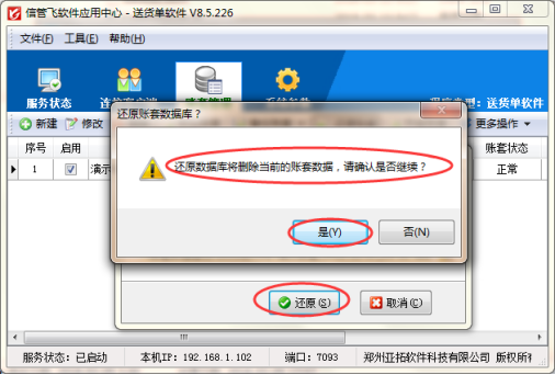 亞拓旗下所有軟件安裝完成后,數據備份均保存在安裝軟件目錄下的賬套文件備份文件夾中,如需要更換電腦使用,需要把最近日期的備份數據復制到新的電腦上,在新的電腦上安裝好軟件,在應用中心程序中對之前的賬套備份數據進行還原操作,就可以把之前的所有數據同步到這個電腦上。 本文章以信管飛送貨單軟件為例,示范下如何還原賬套備份。 把備份數據.dbk格式的文件復制到電腦桌面上,方便還原賬套進行選擇。打開應用中心程序(紅色圖標),在賬套管理中點擊賬套文件(如沒有賬套可以