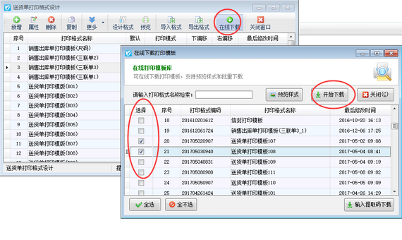 信管飛送貨單軟件、信管飛倉庫管理軟件、亞拓管理軟件等都支持自定義打印格式模版,軟件內內置有多個打印格式模版,并支持在線下載打印格式模版,本篇文章以信管飛送貨單軟件為例詳細介紹一下如何在線下載送貨單打印格式模版? 在功能導航窗點擊“業務處理”—》“新開送貨單”即可打開新開送貨單界面,然后在工具欄點擊“打印”—》“打印格式設計”打開“送貨單打印格式設計”窗口(圖一),在打印格式設計窗口可以查看軟件內置的打印格式模版,點擊“在線下載”按鈕,系統彈出“在線下載打印模版”窗口,勾選需要下載的打印格式模版,然后點擊“開始下載”按鈕即