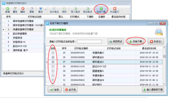 信管飛送貨單軟件、信管飛倉庫管理軟件、亞拓管理軟件等都支持打印快遞單,軟件內置的有多個快遞單打印模版,并支持在線下載快遞單模版,本篇文章以信管飛送貨單軟件為例詳細介紹一下如何在線下載快遞單打印模版? 在功能導航窗點擊“業務處理”—》“新開送貨單”即可打開新開送貨單界面,然后在工具欄點擊“打印”—》“快遞單打印格式設計”,如圖1所示,打開“快遞單打印格式設計”窗口,在打印格式設計窗口可以查看軟件內置的快遞單打印格式模版,點擊“在線下載”按鈕,系統彈出“在線下載打印模版”窗口,勾選需要下載的快遞單打印格式模版,然后點擊“開始