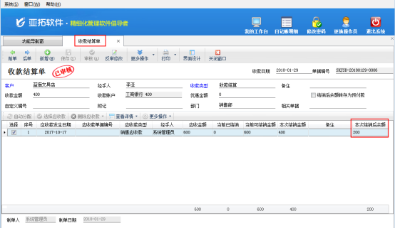 亞拓軟件自主開發的信管飛送貨單軟件、亞拓管理軟件等都支持將送貨單(銷售單)進行收款結銷操作,有時可能存在送貨單商品明細開錯的情況。如果當前送貨單的應收款已結銷,軟件是不允許再修改此單據的,如下圖1所示:圖1 本篇文章以信管飛送貨單為例,示范下如何修改應收款已結銷的送貨單單據,打開應收款已結銷的送貨單單據,在更多操作下點擊“查看應收款及結銷情況”,彈出應收款及結銷情況界面,點擊“查看結算單”可以打開本單據的應收款結算單界面,如下圖2、3所示:圖2圖3