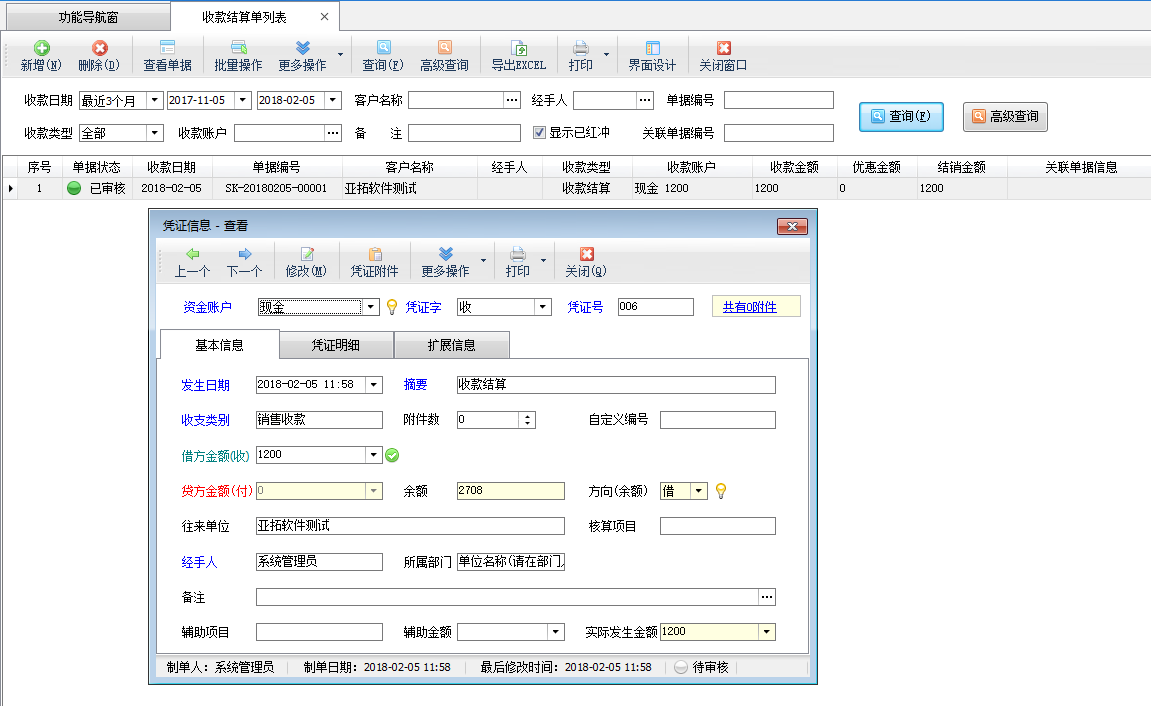 信管飛出納記賬軟件(原“紅管家財務出納記賬系統”)是一款針對各類企事業單位財務出納記賬開發的,集現金日記賬記賬與點驗、銀行日記賬記賬與核帳、應收應付往來賬管理、票據管理(支票管理、承兌匯票管理)、發票管理、工資管理、員工借款管理、費用報銷管理等為一體的財務出納管理記賬軟件。 信管飛出納記賬軟件在收/付款結算時支持轉記出納憑證,那么收/付款結算單在轉記出納日記賬憑證之后,如何快速找到此收/付款結算單相關的日記賬憑證呢?本篇文章以查看收款結算單已轉記的相關出納憑證為例來介紹一下出納記賬軟件內如何查看收/付款結算單的相關出納憑