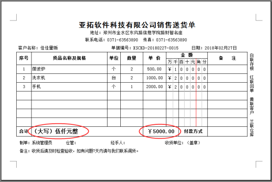 信管飛送貨單軟件、信管飛倉庫管理軟件及亞拓管理軟件等都支持開單打印單據,軟件內置了十幾種打印格式模版,同時支持自定義打印格式模版,本篇文章我們以亞拓管理軟件為例詳細介紹一下打印模版中如何設置財務單元格顯示位數? 演示視頻觀看鏈接:打印模版中如何設置財務單元格顯示位數演示視頻 以軟件內置模版B03為例(圖一),此模版設置金額的最高位為十萬位,那么部分用戶需要顯示百萬或者千萬如何設置呢?下面我們介紹一下操作過程。圖一 打印模版(B03)預覽效果圖 打開一
