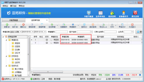 亞拓管理軟件、信管飛倉庫管理軟件、信管飛送貨單軟件、信管飛出納記賬軟件都支持把軟件數據導出為Excel文件,有些明細匯總表導出的Excel文件中日期顯示格式是“YYYY-MM-DD HH:MM:SS”的樣式,如圖1所示。如果用戶導出的Excel中日期不想顯示時分秒,可以在軟件中設置日期的顯示格式,導出的Excel中日期格式是和軟件界面日期格式保持一致的。下面我們以信管飛送貨單軟件的送貨明細對賬單為例,介紹一下如何讓導出的Excel中單據日期不顯示時分秒?圖1 登錄軟件,在功能導航窗點“業務處理”,軟件最右側相關查詢統計中