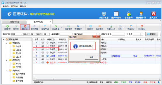 紅管家送貨單中內置了一個簡單的流程:待簽回(新開單)-》已簽回(業務員送貨回來或者客戶已簽收快遞)-》已過賬(財務確認已收到貨款),用戶可以單據變化選擇標記單據狀態,有時候會遇到需要刪除已簽回單據的情況。 本文介紹下如何刪除“已簽回”狀態的送貨單單據,在功能導航窗選擇業務處理,打開送貨單列表,可以選擇一筆“已簽回”狀態的單據,點擊刪除按鈕,會彈出提示信息“當前單據處于“待簽回”狀態,不能刪除!”,如下圖1所示:圖1 在送貨單列表,選擇“已