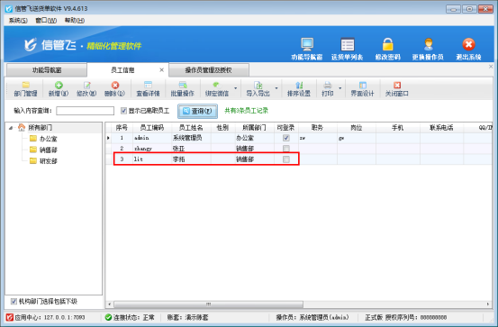 信管飛軟件支持設置多個可登錄操作員,可不同人員登錄軟件進行操作開單。在員工信息界面,可登錄員工對應的可登錄狀態(tài)顯示勾選,如下圖所示: 如何設置員工“李拓”可登錄狀態(tài)取消勾選?在功能導航窗點擊“系統(tǒng)管理”—》“操作員及授權”界面。選擇操作員“李拓”,點擊工具欄“刪除操作員”,刪除成功后員工不能再登錄軟件,如下圖所示: 刪除成功后,返回至“員工信息”界面,點擊“查詢”刷新,可看到員工“李拓”的可登錄已取消勾選,如下圖所示: