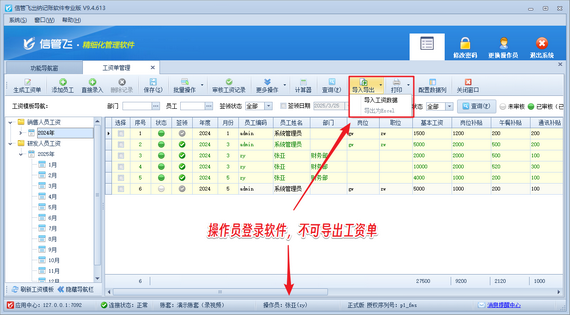 在財務管理日益精細化的今天,一款專業(yè)的出納記賬軟件顯得尤為重要。信管飛出納記賬軟件憑借其強大的工資管理功能,成為眾多企業(yè)的首選。該軟件不僅支持自定義工資模板,還能快速生成工資單,極大地提升了工作效率。 尤為值得一提的是,信管飛出納記賬軟件在安全性上也下足了功夫。通過設置操作員權限,企業(yè)可以確保敏感信息的保密性。例如,禁止操作員導出工資記錄,有效防止信息泄露。 具體操作步驟簡單明了:登錄軟件后,進入“系統(tǒng)管理”的“操作員及授權”界面,選擇對應操作員并取消其工資單管理的“導出”權限,保存設