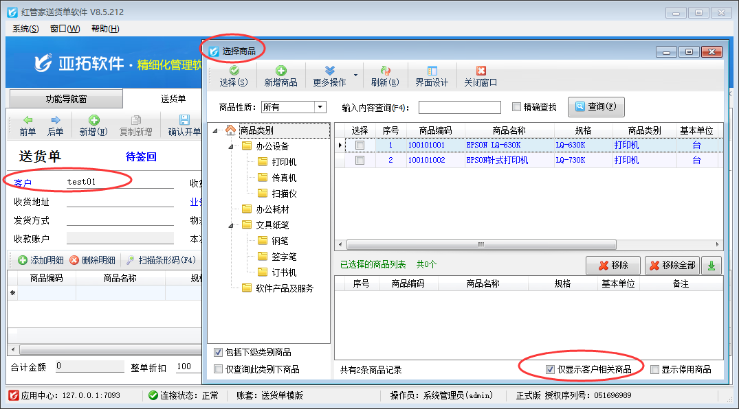 亞拓管理軟件、紅管家倉庫管理軟件和紅管家送貨單軟件開單時都支持選擇系統(tǒng)內已錄入的商品信息,進行快速選擇商品來開單。選擇商品時在選擇商品窗口默認是可以顯示所有商品(圖一),但是部分用戶在選擇商品時只需要顯示此客戶相關的商品,如何設置呢?本篇文章我們以紅管家送貨單軟件為例來詳細介紹一下如何設置在選擇商品窗口僅顯示客戶相關商品?圖一 新開送貨單 在功能導航窗點擊“系統(tǒng)管理”—》“系統(tǒng)參數配置”—》“業(yè)務參數”,即可進入到“業(yè)務參數”配置界面,在數據選擇參數內打鉤啟用“在選擇商品窗口顯示客戶相關商品”參數,然后點擊“保存”按鈕保