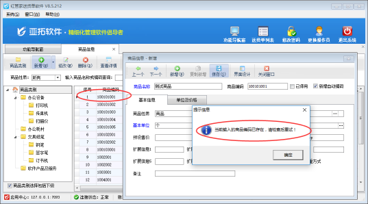 亞拓軟件自主研發(fā)的亞拓管理軟件、紅管家送貨單軟件、紅管家倉庫管理軟件等都支持新增商品信息,為了避免增加的商品信息出現(xiàn)重復,軟件支持參數設置商品編碼不可重復。 以紅管家送貨單軟件為例,在系統(tǒng)管理—》系統(tǒng)參數配置—》業(yè)務參數內將“數據可否重復參數”中的“商品編碼可重復”參數的勾選取消,然后保存設置。如下圖所示: 設置完成后,打開功能導航窗的“基礎資料”—》“商品信息”,新增一個商品,輸入和之前已增加過的商品一樣的編碼,保存時系統(tǒng)會提示“當前輸入的商品編碼已存在,請檢查后重試!”,如下圖所示