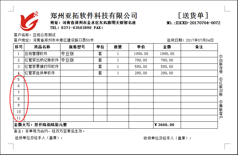 紅管家送貨單軟件、紅管家倉庫管理軟件及亞拓管理軟件等都支持開單打印單據,軟件內置了十幾種打印格式模版供客戶選擇使用,同時也支持自定義打印格式模版。一般情況下打印模版設置自動增加空行時,空白行會不再顯示行號,如下圖一所示,如何設置才能讓表格一直顯示序號(行號),即使追加的空行也顯示?本篇文章以紅管家送貨單軟件為例來示范一下如何設置才能讓表格一直顯示序號(行號)。 圖一 送貨單預覽效果圖 打開一個已開好的送貨單單據,然后在工具欄點擊“打印”—“打印格式設計”按鈕,進入打印格式設計界面,選擇需要調整的打印