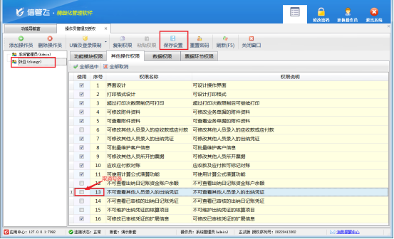 信管飛出納記賬軟件是一款集現(xiàn)金/銀行日記賬、應(yīng)收應(yīng)付款管理、工資管理、發(fā)票管理等為一體的綜合性財(cái)務(wù)出納管理軟件,有用戶在使用軟件時,系統(tǒng)管理員賬號登錄軟件可以看到日記賬憑證,但是操作員賬號登錄軟件確無法查看憑證,如下圖所示。 出現(xiàn)以上問題的原因是:操作員賬號沒有查看其他人員錄入的出納憑證的權(quán)限。 解決方法如下:使用系統(tǒng)管理員賬號登錄軟件,在功能導(dǎo)航窗點(diǎn)擊“系統(tǒng)管理”—》“操作員及授權(quán)”打開操作員管理及授權(quán)界面,選擇操作員賬號,在“其他操作權(quán)限”界面將