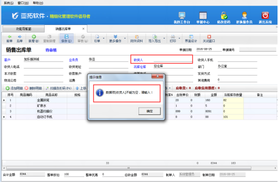為了避免在開單的時候漏掉必須要填寫的信息,亞拓管理軟件、紅管家倉庫管理軟件、紅管家送貨單軟件等支持設計單據主體必填項。下邊以亞拓管理軟件專業版“銷售出庫單”開單為例,設置單據主體必填項。 新增一個銷售出庫單,軟件中已經設置好“客戶、業務員、出庫倉庫”為必填項(必填項設置為藍色顯示),如果要再增加“收貨人”為必填項,就需要進行設置,具體設計如下圖所示: 界面設計保存成功以后,此時單據主體中必填項“收貨人”變為藍色顯示,錄入單據數據,收貨人不填寫保存單據會提示“數據項[收貨人]不能為空,請