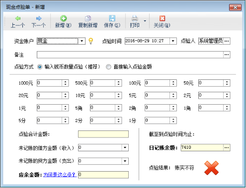 亞拓管理軟件標準版和專業版、紅管家出納記賬軟件標準版和專業版都包括出納管理功能,出納管理主要包含現金日記賬、銀行日記賬、現金點驗單、銀行對賬單、銀行對賬和出納期末結賬等功能。下面我們以亞拓管理軟件專業版為例講一下出納模塊中現金點驗單的使用方法。 在功能導航窗,點擊“出納管理”—》“現金點驗單”,即可進入“現金點驗單”界面,如圖1所示。圖1 現金點驗單界面(1)新增點驗單:點擊工具欄中的“新增點驗單”按鈕,系統會彈出“新增點驗單”窗口,如圖2所示。圖2 新增現金點驗單界面 資金賬戶:必填