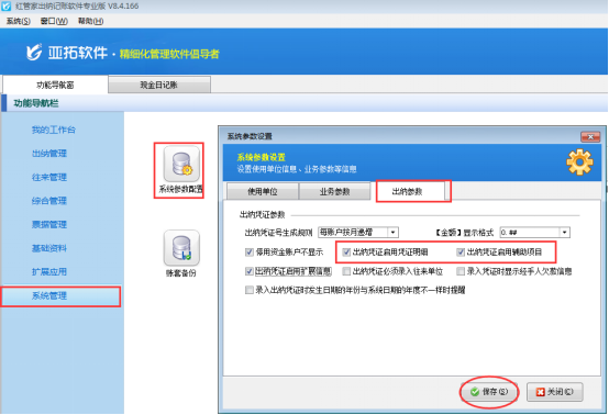 紅管家出納記賬軟件、亞拓管理軟件(標準版、專業版)中的出納管理模塊,在新增憑證中有的需要填寫輔助項目和憑證明細,軟件支持設置在新增憑證時顯示這些項目。下邊以出納軟件為例,展示一下如何設置憑證顯示憑證明細和輔助項目項。    打開“系統管理”—》“系統參數”,選擇出納參數界面選擇對應的出納參數進行勾選保存。具體如下圖1所示: