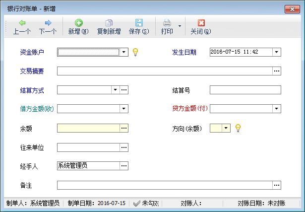 紅管家出納記賬軟件是一款針對各類企事業單位財務出納記賬開發的,集現金日記賬記賬與點驗、銀行日記賬記賬與核帳、應收應付往來賬管理、票據管理(支票管理、承兌匯票管理)、發票管理、工資管理、員工借款管理、費用報銷管理等為一體的財務出納管理記賬軟件(出納管理軟件)。本篇文章以紅管家出納記賬軟件專業版為例詳細介紹下銀行對賬單的使用方法。 在功能導航窗,點擊“出納管理”—》“銀行對賬單”,即可進入“銀行對賬單”界面,如下圖所示: 新增銀行對賬單:點擊工具欄中的“新增”按鈕,系統會彈出“新增銀行對賬