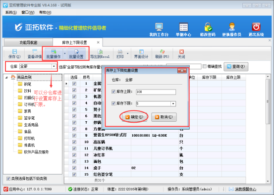 亞拓管理軟件專業版、標準版、星光版和紅管家倉庫管理軟件支持庫存管理功能,為了更直觀的發現庫存數量,軟件中可以對商品庫存數量進行庫存上下限設置,并可以在倉庫管理模塊中的“相關查詢統計”中進行庫存預警查詢。 以“亞拓管理軟件專業版”為例,介紹如何設置庫存的上下限數量,在功能導航窗選擇“倉庫管理”—》“庫存上下限”進入庫存上下限設置界面,具體如圖1所示: 圖1:庫存上下限設置界面 以下為“庫存上下限設置”的功能操作說明: (1)可以選擇倉庫,默認