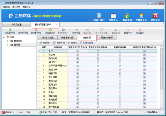亞拓管理軟件、紅管家出納記賬軟件、紅管家倉庫管理軟件等都可以設置操作員的查看修改業務單據權限。通過設置操作員的“數據權限”,更清晰方便的管理分配的操作員單據權限。通過“系統管理”---》操作員及授權進入操作員管理及授權界面,在權限模塊可看到“數據權限”,在此設置操作員的“可修改有查看權限的數據”的權限,如圖1所示: 圖1 通過系統管理員登錄軟件進行修改操作員權限,只有系統管理員才能修改操作員權限,我們以操作員“李靜”為例介紹下數據權限的設置,通過“采購管理”—》“采購訂單”—》“數據權限”。在數據權限界面,勾選