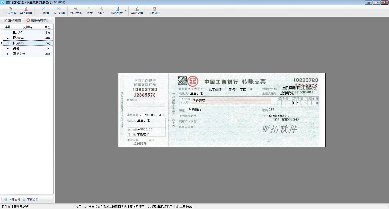 紅管家票據打印軟件是亞拓軟件針對企事業單位票據管理及打印需求而開發的一款票據管理軟件,主要包括支票管理、承兌匯票管理、其他票據管理(銀行進賬單、電匯憑證等)、快遞單管理、萬能票據打印、票據打印模板管理、票據查詢檢索等功能。 紅管家票據打印軟件開單后,自動保存數據,方便以后查閱或打印,填開支票、承兌匯票、快遞單以及其他票據時,軟件支持添加文檔、圖表等附件資料,可掃描或導入與票據相關的電子文件,方便用戶更全面、直接地查詢票據的全過程,有利于企業票據管理控制。下面我們介紹一下附件資料管理功能的使用。 &n