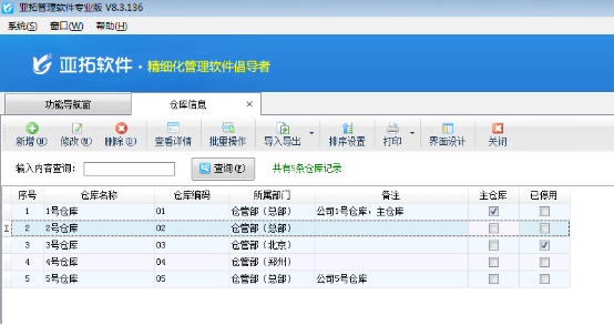 亞拓管理軟件和紅管家倉庫管理軟件都支持分倉庫管理商品,其中亞拓管理軟件標準版和專業(yè)版、紅管家倉庫管理軟件標準版和專業(yè)版都支持倉庫調(diào)撥功能,可以方便的進行倉庫之間的貨品轉(zhuǎn)移。軟件中的倉庫信息可維護所有業(yè)務(wù)倉庫,下面我們介紹一下倉庫信息的管理。 在功能導(dǎo)航窗點擊“基礎(chǔ)資料”—》“倉庫信息”,即可進入倉庫信息管理功能,其界面如下圖所示: 新增倉庫:增加新的倉庫信息,倉庫信息由名稱、編碼、機構(gòu)部門、備注組成,編碼可選擇自動生成。 修改倉庫信息:選中倉庫記錄,