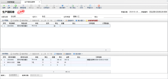 生產(chǎn)過程中可通過開“生產(chǎn)領(lǐng)料出庫單”領(lǐng)取原材料出庫。生產(chǎn)領(lǐng)料單包括生產(chǎn)產(chǎn)品明細和領(lǐng)料明細兩部分,支持根據(jù)“生產(chǎn)模板”自動生成需要的原材料明細。生產(chǎn)明細中的商品并不影響倉庫庫存,領(lǐng)料明細中的原材料將會出庫。 生產(chǎn)領(lǐng)料單是屬于生產(chǎn)管理模塊,生產(chǎn)管理模塊是屬于擴展模塊,只有在亞拓管理軟件專業(yè)版、紅管家倉庫管理軟件專業(yè)版中才能使用,下面我們來演示一下具體的操作步驟。 在功能導(dǎo)航窗,點“生產(chǎn)管理”—》“生產(chǎn)領(lǐng)料出庫”,即可進入生產(chǎn)領(lǐng)料出庫界面,如下圖1所示:圖1引單:生產(chǎn)領(lǐng)料出庫單可以引用“生產(chǎn)
