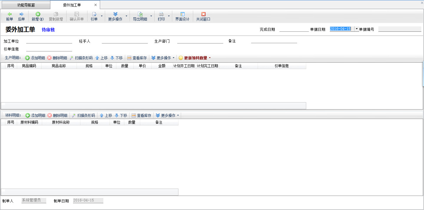 亞拓管理軟件標準版及以上版本可以購買委外加工管理功能模塊來管理生產(chǎn)業(yè)務(wù)中的委外代加工業(yè)務(wù),委外加工單類似于自己生產(chǎn)情況下的生產(chǎn)任務(wù)單,用于向外部代加工廠下單加工任務(wù)。委外加工單可以引用生產(chǎn)計劃單,也就是說軟件支持生產(chǎn)計劃單一部分自己生產(chǎn),一部分由外部代加工廠生產(chǎn)的情況。 在功能導(dǎo)航窗,點“生產(chǎn)管理”—》“委外加工”—》“委外加工單”,即可進入委外加工單界面,如下圖所示: 為了方便后續(xù)估算和采購原材料,軟件分為上下兩部分,上方為生產(chǎn)產(chǎn)品明細,下方為用料明細,添加一個委外加工產(chǎn)品后,軟件會