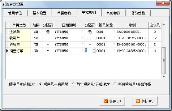 紅管家送貨單軟件中在開單時軟件會自動生成一個單據編號,因此可以對單據編號規則進行設置,這樣我們對單據進行查詢時可根據單據編號就可以讀取單據信息,軟件中支持根據自己的實際業務需求來設置單據規則,下面我們演示一下具體的操作步驟。 在主窗口菜單“系統管理”—》“系統參數設置”菜單項,點擊“單據規則”,如下圖1所示:圖11、單據編號規則設置:可分別對送貨單、收款單、退貨單、銷售訂單進行單據規則設置,我們可以根據自己的需求進行單據編號設置,軟件中內置的分隔符、日期規則以及編號位數有多種樣式可供我們選擇,前綴你可以自己設置,示例中可