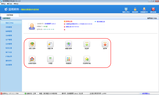 亞拓軟件開發的亞拓管理軟件、亞拓倉庫管理軟件、紅管家票據打印軟件等都包含我的工作臺功能,我的工作臺中可以查看當前操作員信息、最新的通知公告、業務提醒信息,并且可以添加一些常用的功能模塊。下面我們以亞拓管理軟件專業版為例詳細介紹下我的工作臺功能是如何使用的。 首先登陸亞拓管理軟件,點擊“功能導航窗”—“我的工作臺”,可以打開我的工作臺頁面,下圖為我的工作臺界面。圖一 我的工作臺界面 在我的工作臺界面中,首先可以查看當前操作員信息及最新公告信息,另外點擊“添加常用功能”按鈕可以添