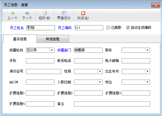 亞拓管理軟件、紅管家倉庫管理軟件、紅管家票據打印軟件、紅管家財務出納記賬系統、紅管家送貨單軟件都支持對公司員工信息的管理。員工信息管理實現員工資料的維護,可對員工顯示順序進行設置,軟件都支持通過Excel文件導入員工資料。下面我們以亞拓管理軟件為例介紹下在軟件中如何管理員工信息。 登錄軟件,在功能導航窗中點擊“基礎資料”—》“員工信息”,即可進入“員工信息”維護功能,其界面如下圖所示: 新增員工:點“新增”按鈕可以增加員工信息。 修改員工信息:點“修