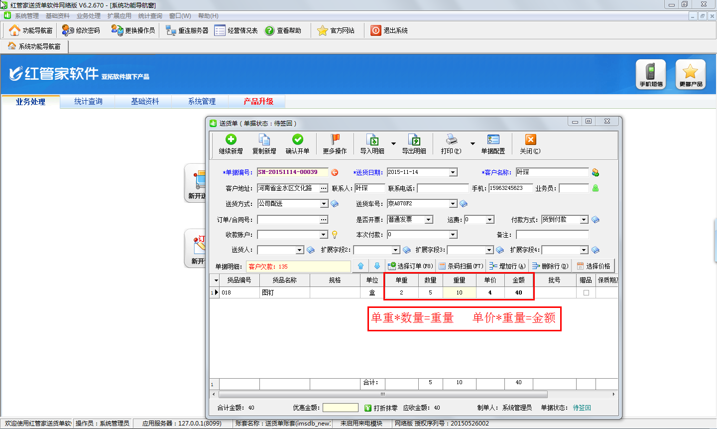 亞拓軟件開發(fā)的紅管家送貨單軟件中支持按重量計(jì)算金額,由于多數(shù)用戶是按數(shù)量來計(jì)算金額的,因此在送貨單打印軟件中開單時(shí),明細(xì)中的金額默認(rèn)取單價(jià)乘以數(shù)量的值(即 金額 = 單價(jià) * 數(shù)量),那么部分用戶的產(chǎn)品如果需要按重量計(jì)算金額(比如農(nóng)副產(chǎn)品)在送貨單管理軟件中又該如何進(jìn)行設(shè)置呢?下面我們就詳細(xì)介紹下紅管家送貨單軟件中如何設(shè)置按重量來計(jì)算金額? 首先打開功能導(dǎo)航窗,點(diǎn)擊“系統(tǒng)管理”—》“系統(tǒng)參數(shù)”—》“單據(jù)參數(shù)”,將默認(rèn)復(fù)選的“啟用數(shù)量和金額計(jì)算公式”選項(xiàng)打勾取消,然后打勾選中“金額=總重*單價(jià)”選項(xiàng)啟用按重量計(jì)算金額,配置