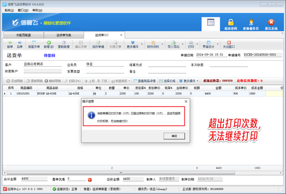 企業(yè)管理中,單據(jù)打印至關(guān)重要。但如何避免單據(jù)重復(fù)打印、修改單據(jù)導(dǎo)致的混亂?信管飛軟件為你提供完美解決方案! 信管飛軟件支持設(shè)置報表打印次數(shù)限制,確保單據(jù)打印的合規(guī)性。一旦打印次數(shù)達(dá)到預(yù)設(shè)上限,系統(tǒng)將自動提示,防止重復(fù)打印。 以信管飛送貨單軟件為例,通過簡單設(shè)置,即可實現(xiàn)操作員打印次數(shù)權(quán)限控制。首先,在系統(tǒng)參數(shù)中設(shè)置打印次數(shù)提示; 然后,在操作員權(quán)限管理中,取消操作員“超過打印次數(shù)限制仍可打印”的權(quán)限。 這樣,每張單