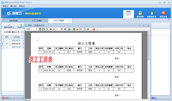 在企業(yè)管理中,計件工資的核算是一項既繁瑣又重要的工作。為了幫助企業(yè)更好地管理計件工資,信管飛出納記賬軟件提供了全面且精準(zhǔn)的解決方案。 該軟件支持用戶輕松設(shè)置不同工種的計件單價,確保每一筆工資的計算都準(zhǔn)確無誤。用戶只需將相關(guān)數(shù)據(jù)錄入系統(tǒng),軟件便會自動進(jìn)行工資計算,大大減輕了財務(wù)人員的負(fù)擔(dān)。 更為便捷的是,信管飛出納記賬軟件支持實時錄入每日生產(chǎn)數(shù)量,系統(tǒng)能夠自動進(jìn)行匯總和統(tǒng)計,即時生成工資報表。這不僅提升了工作效率,還確保了數(shù)據(jù)的準(zhǔn)確性和及時性。 工資條