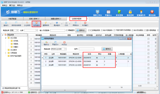 信管飛RMS專業(yè)版、信管飛倉庫管理軟件支持批號管理功能,可設(shè)置商品分批次出入庫以及查詢不同批次商品的庫存數(shù)量。本文示范下如何使用? 首先需要在基礎(chǔ)資料商品信息中勾選“啟用批號管理”,如下圖所示: 啟用批號管理后打開采購管理“采購入庫單”,界面設(shè)計單據(jù)明細(xì)中勾選顯示出“批號”,新增采購入庫單,選擇同一個商品,錄入不同批號不同入庫數(shù)量,如下圖所示: 商品入庫完成后,點擊銷售管理“銷售出庫單”,選擇此商品出庫