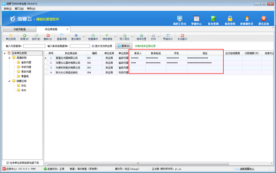 信管飛RMS支持基礎(chǔ)資料數(shù)據(jù)維護(hù),包括客戶信息、供應(yīng)商信息、商品信息、員工信息、倉庫信息、資金賬戶等信息,另外,也支持對基礎(chǔ)資料數(shù)據(jù)項(xiàng)進(jìn)行權(quán)限控制,本篇文章介紹一下如何設(shè)置操作員不可查看供應(yīng)商聯(lián)系信息? 演示視頻觀看鏈接:信管飛RMS如何設(shè)置操作員不可查看供應(yīng)商聯(lián)系信息演示視頻 首先需要啟用基礎(chǔ)資料數(shù)據(jù)項(xiàng)權(quán)限控制參數(shù),在功能導(dǎo)航窗點(diǎn)擊“系統(tǒng)管理”—》“系統(tǒng)參數(shù)配置”—》“業(yè)務(wù)參數(shù)”打開業(yè)務(wù)參數(shù)配置界面,然后在系統(tǒng)安全及權(quán)限參數(shù)內(nèi)勾選啟用“啟用基礎(chǔ)資料數(shù)據(jù)項(xiàng)權(quán)限控制”參數(shù),然后點(diǎn)擊“保存