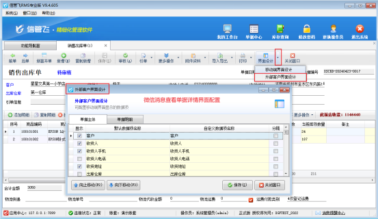 信管飛RMS軟件和信管飛倉庫管理軟件均支持界面設計,可以設置界面顯示數據項。新版本界面設計支持設置單據明細顯示配置,可選擇后控制界面顯示數據項,本文以“信管飛軟件”為例,示范如何配置? 演示視頻觀看鏈接:信管飛RMS軟件中單據明細控制功能如何使用? 以“銷售出庫單”為例,在銷售出庫單界面,點擊工具欄“界面設計”,在單據主體中,勾選顯示“擴展信息1”,向上移動位置,修改自定義列名,取值方式選擇“單據明細控制”,如下圖所示: &nb