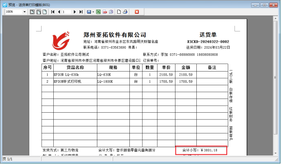 信管飛軟件支持自定義打印模板設計,用戶可以根據自身業務需求調整打印模板樣式和設計格式,本文介紹下打印模板如何設置金額四舍五入保留兩位小數。 本文以“信管飛送貨單軟件”為例,示范下打印模板如何設置金額四舍五入保留兩位小數,打開一個送貨單,金額存在小數,打印預覽圖如下: 打印模板四舍五入顯示兩位,在開單界面打印下點擊“打印格式設計”,選擇打印模板,點擊“設計格式”進入模板設計器,金額設置四舍五入需要調用RMRound函數,打開金額文本框,復制取整調用數據