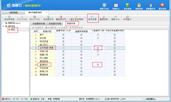 進銷存軟件具備靈活的操作員賬號及權限設置功能,這有助于企業實現精細化的權限管理。以信管飛RMS軟件為例,介紹一下信管飛軟件如何設置操作員只能查看本人所屬單據? 在功能導航窗點擊“系統管理”—》“操作員及授權”,進入操作員管理及授權界面,選擇操作員“張亞”,在“數據權限”中,把“業務單據(單據中心)”權限以及“查詢統計”權限對應的“只查看本人數據”權限勾選啟用上,然后保存權限設置,如下圖所示: 權限設置完成后,使用操作員賬號登錄軟件,在銷售單列表中可以